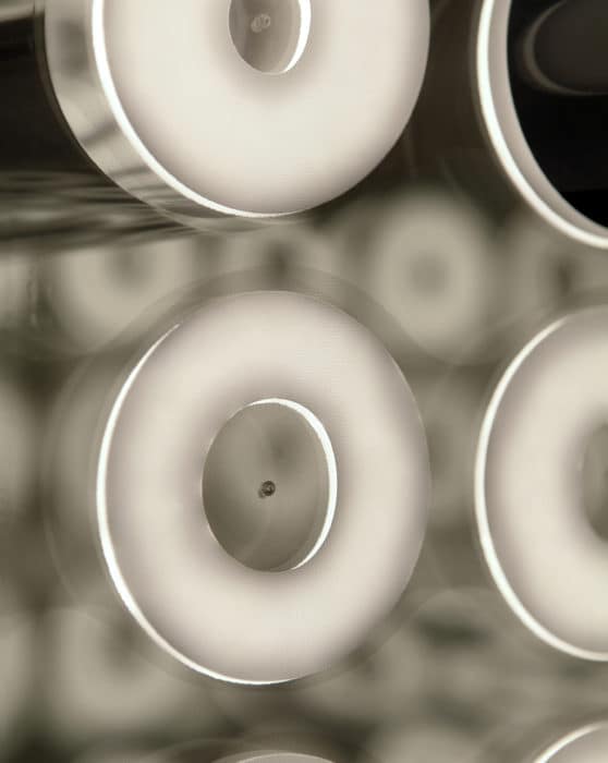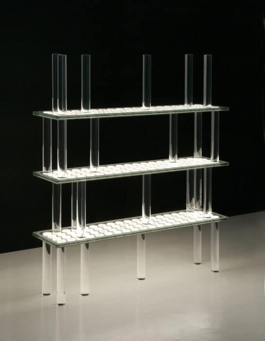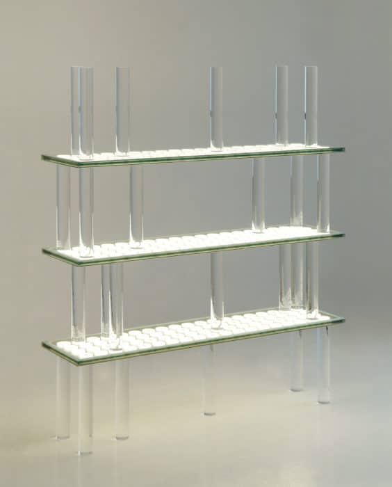 Shelf made of PLANILUM ™, illuminated glass panel that uses the technological principle of the fluorescence of light sources, principle tested for many years.