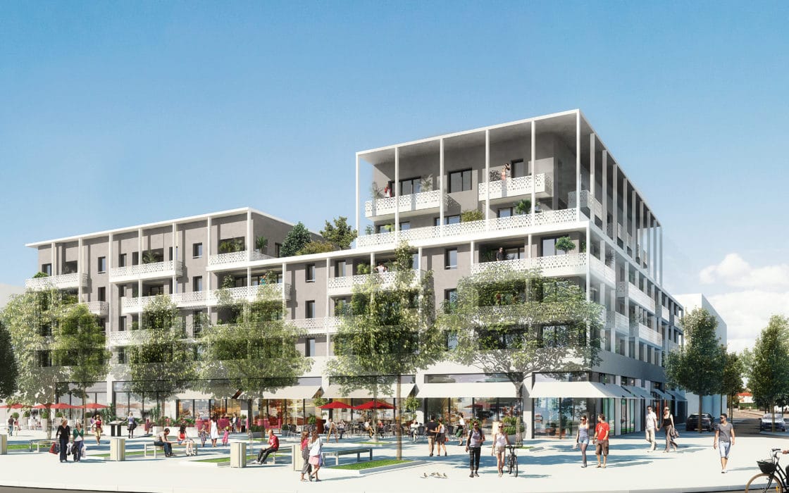The base, dressed in white brick hosts a commercial program in connection with the public square it animates and from which it derives its energy. It has three levels of nice and bright accommodations. The whole is crowned with a double attic.
