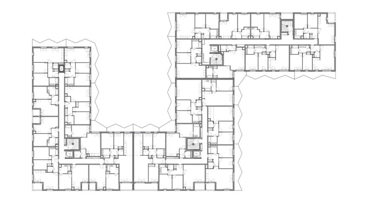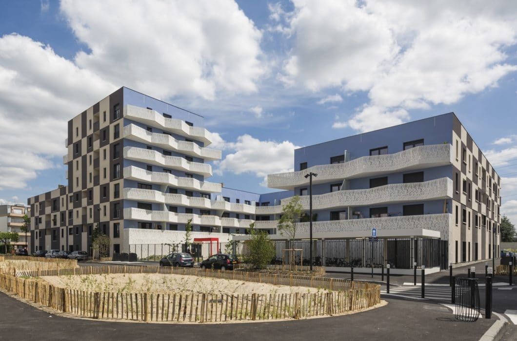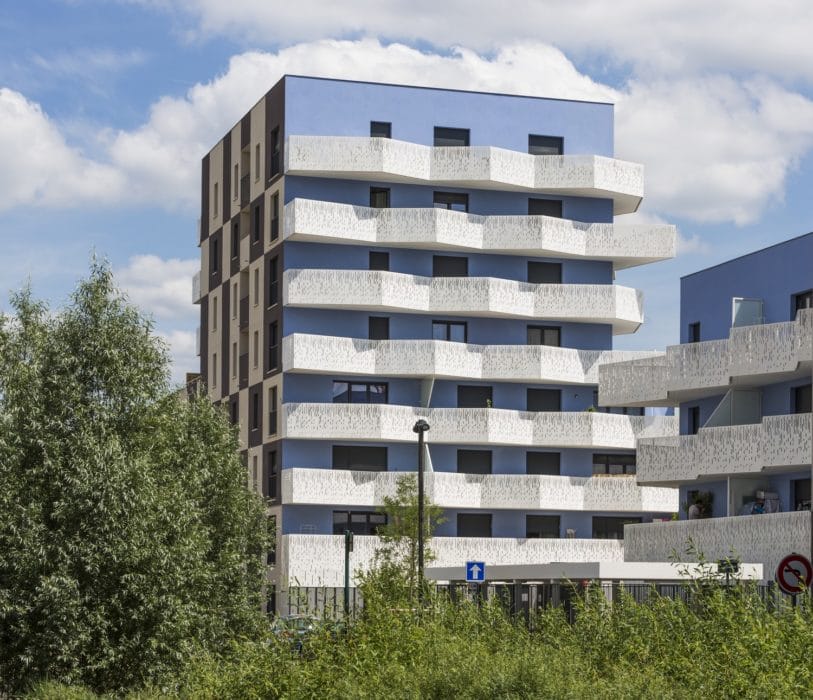 In the center of the block, the pale blue facades look out onto the gardens; balconies run along the side, following a broken linets qui suivent une ligne brisée.