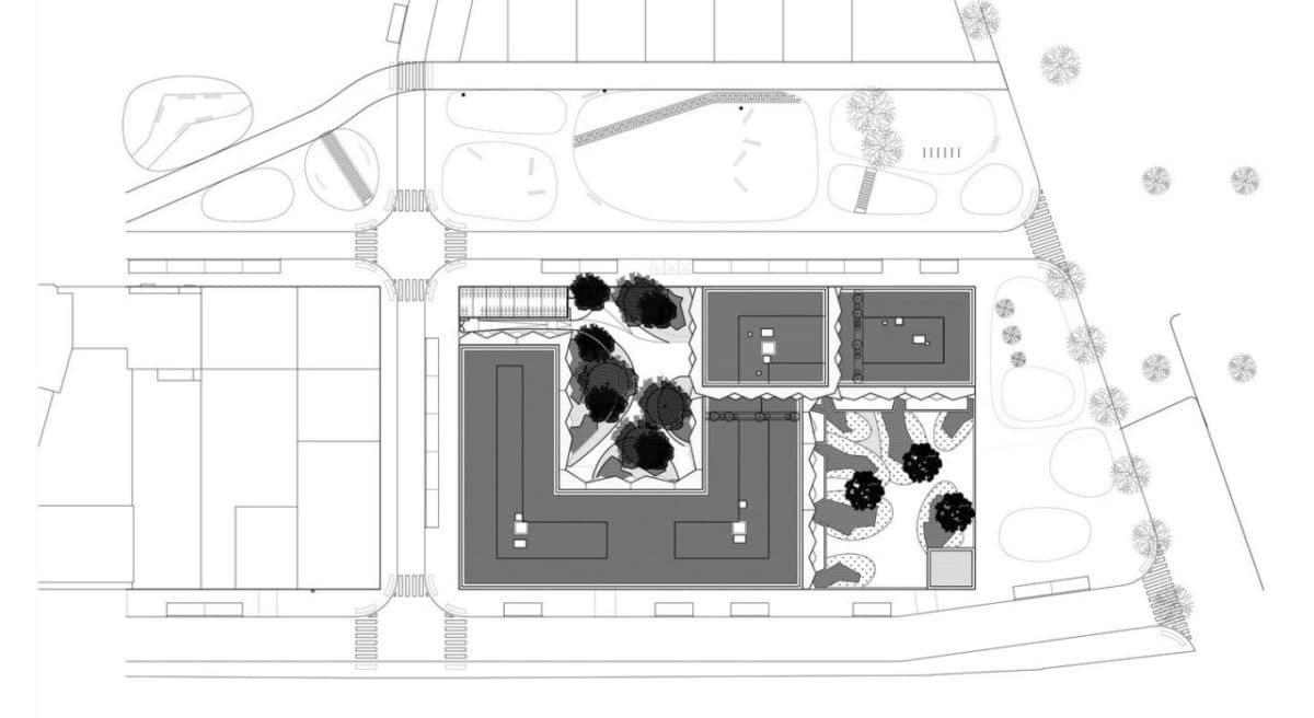 Surrounding the block, the facades are covered in a charcoal gray and ivory white checked pattern. The checkerboard gives rhythm to the facade and integrates the different openings (different typologies of windows and loggias) in accordance with the Local Urbanism Plan (PLU).