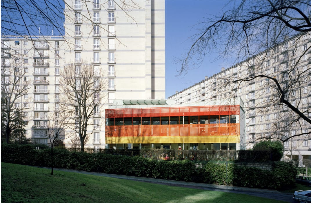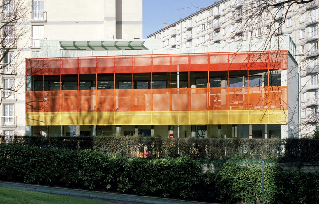 Located in the center of a housing complex on rue de Charenton, the nursery is a small concrete building from the sixties that the program plans to expand. It hosts in the basement technical rooms, the ground floor and first games and sleep rooms for small children (3 and 4 years), the second floor rooms for adults (5 years). The site, very marked by buildings of austere appearance, is distinguished by its abundant vegetation. Also, a set of chromatic layers (red / orange / yellow) resumes the decomposition of the luminous prism that precedes the green and defines the main façade, consisting of a perforated metal polychrome grid. The rest of the building is covered with a light green plastic coating. Inside, the openings, doors, windows are of identical formats, playing scales and heights proper to children. The whole is treated in black, white and primary colors, so as to exaggerate the natural articulation of spaces.