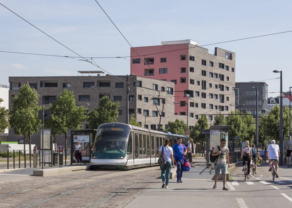 The façades are clad with silver-grey bricks and the inner areas of the plot are finished with a warm pink render. The ground floor arcades picking out the entrances to the buildings and, above all, the shops, are intended to echo Rue des Grandes-Arcades, the main shopping street in the centre of Strasbourg.