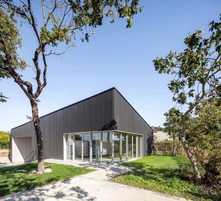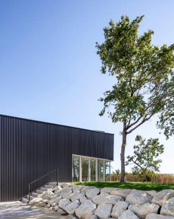 The compact, oblong and facetted building has a lacquered steel cladding whose warm grey tones are reminiscent of the colour of the nearby Gironde cliff faces.