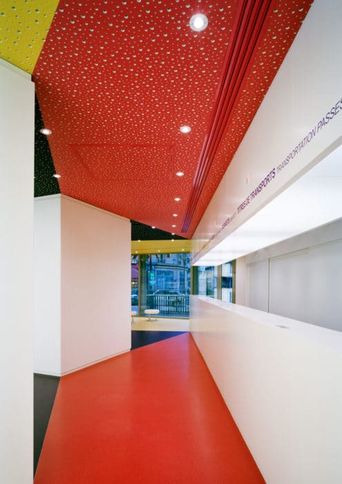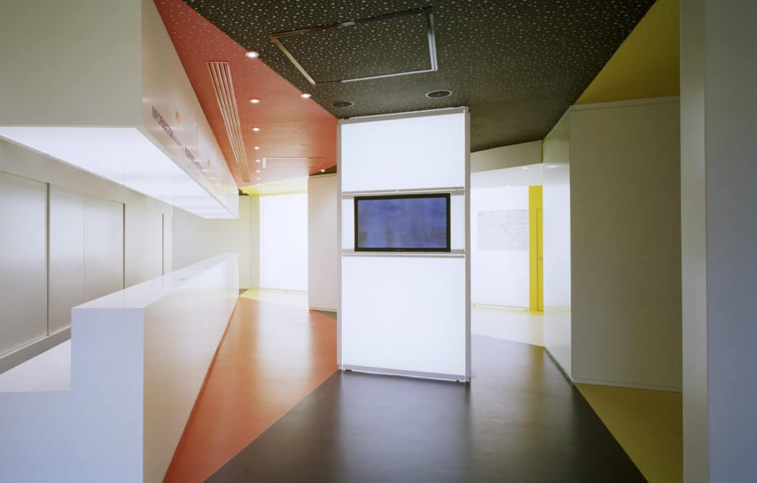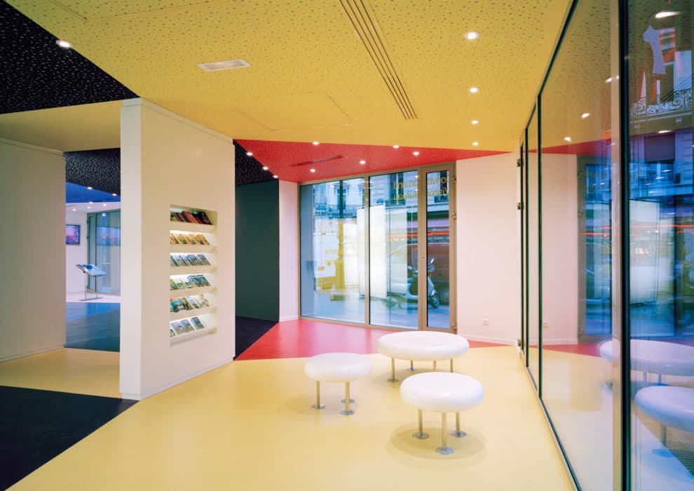 Located on the ground floor and on the ground floor of a typical building on Avenue de l’Opera, the main reception area of the Paris Convention and Visitors Bureau (OTCP) hosts a reception desk. information, a waiting area, and a self-service area. Its glass and stainless steel fronts are designed like boxes that come out of large bays carved on two levels. The entrance door, is thought of as an abstract version of the large blue doors of the Avenue de l’Opera, with double doors and window on the mezzanine. The interior is thought of as a kaleidoscope of primary colors, showing Paris under facets more modern than its traditional clichés. Can accommodate several thousand visitors a day, the place requires simple and robust finishes. All vertical elements are white, opaque (furniture) or backlit (walls). The resin floor and the plaster ceiling are cut in identical trapezoidal shapes, like an echo in the form of the Parisian plot, reduced to the scale of the visitors.