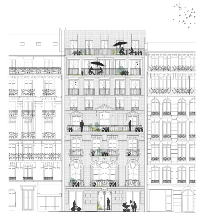 The project involves the extension of a Haussmannian building by integrating part of the existing building. The entire Avenue de Wagram facade has been preserved as well as some interior walls and decorations. On Wagram Avenue, the design of the facade is based on the analysis of the 1886 facade and proposes to extend to the sky, in a superposition of frames and staggered openings that revisit the language of classical architecture . The extension was also conceived according to the quality criteria stated by Haussmann that are readability, diversity, hygiene, lightness and flexibility.