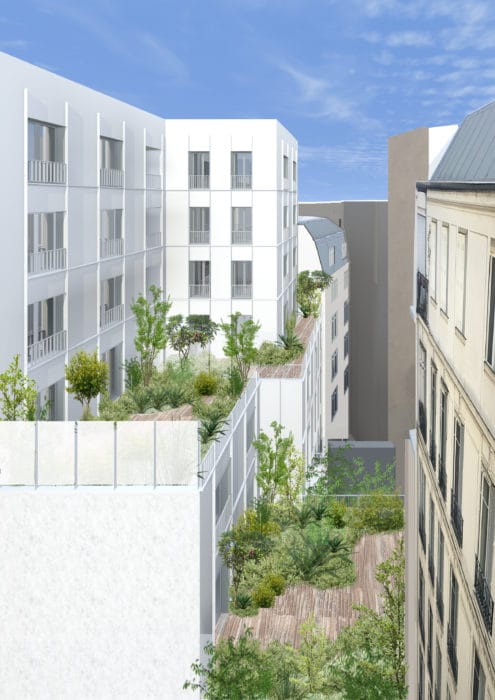 On the courtyard, the facade has several withdrawals that allow the establishment of two hanging gardens, forming with the garden in the ground a series of three planted spaces that integrate nature in the heart of the island.