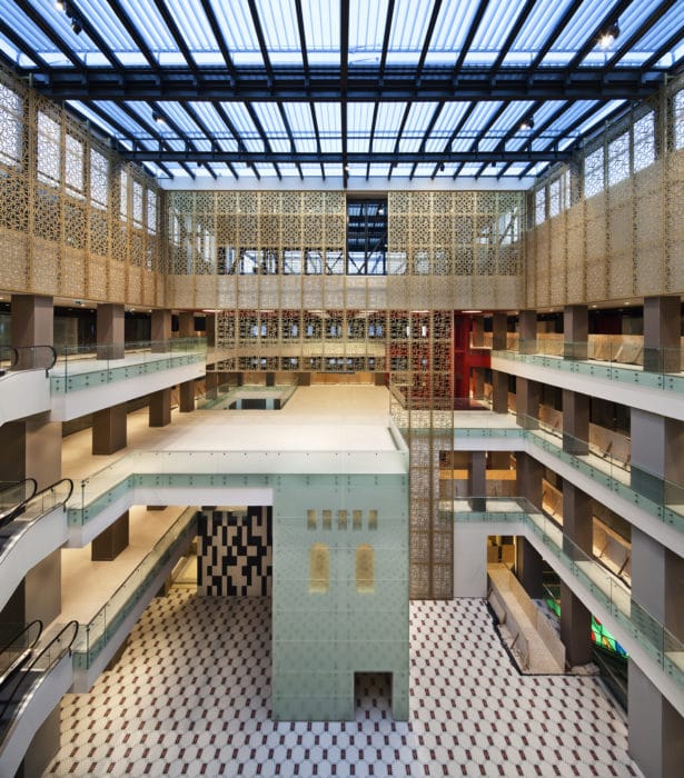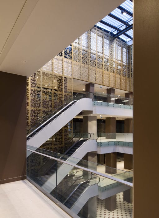 En forme de « U », le bâtiment comprend sept étages et deux niveaux en sous-sol, des boutiques au niveau de la rue, des bureaux aux étages intermédiaires, et dans les étages supérieurs une galerie de commerces et restaurants qui s’articule autour d’un atrium habillé de plaques d’aluminium anodisé découpées au jet d’eau qui filtrent la lumière et sculptent l’espace.