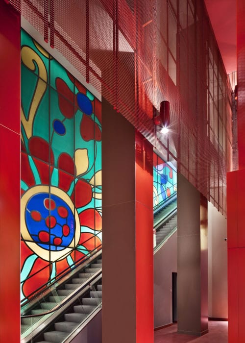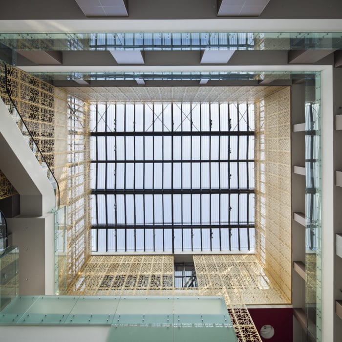 Depuis l’entrée principale située sur Vaci, une séquence d’escalators casse le design rationnel du bâtiment et crée une promenade architecturale étonnante menant au dernier étage qui, protégé du soleil par un auvent du même aluminium découpé, offre aux visiteurs un point de vue inédit sur la ville.