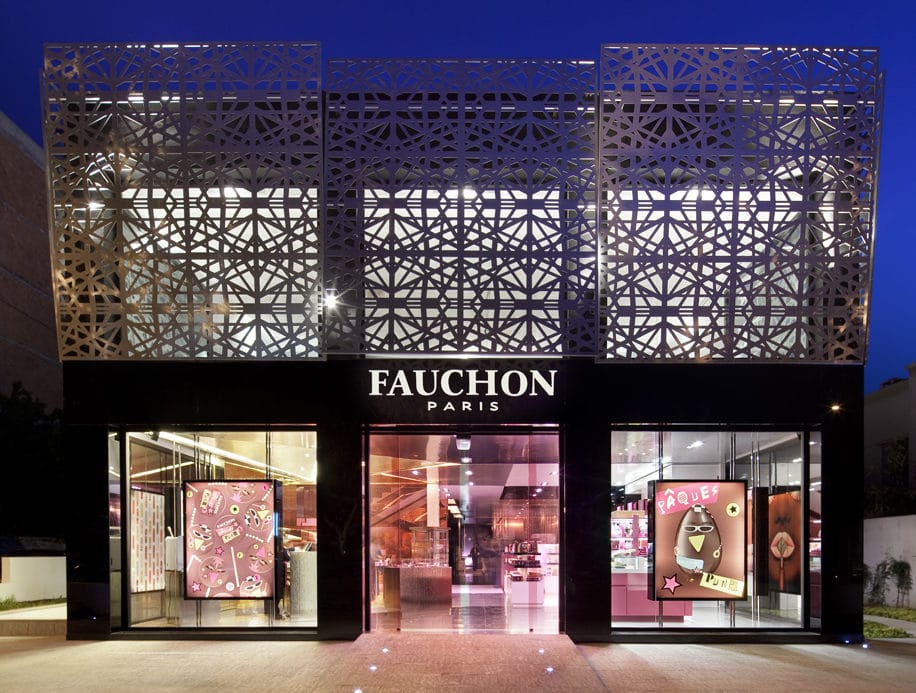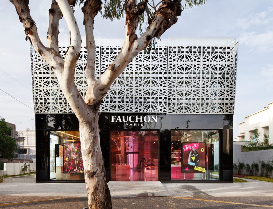 Élaboré à Paris puis en Asie, le concept Fauchon a pris la forme d’un immeuble isolé à Casablanca. Il accueille au sous-sol un laboratoire qui confectionne les produits frais, au rez-de-chaussée les espaces boulangerie, épicerie et restaurant, à l’étage des salles de séminaires.