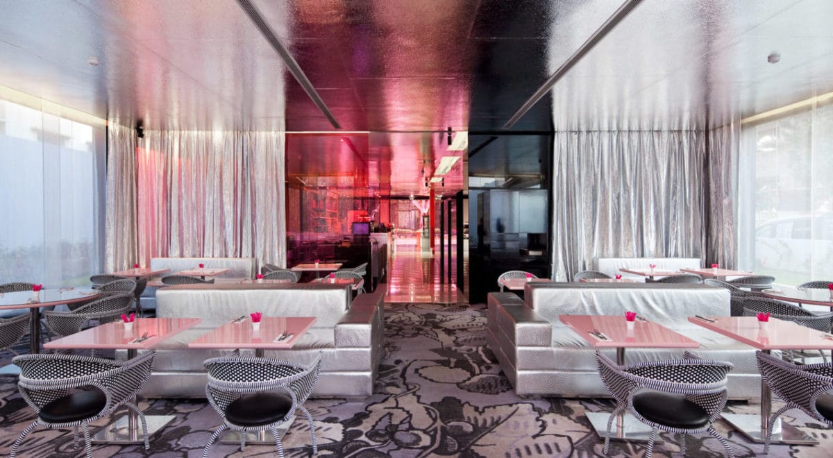 Les grandes baies vitrées sont habillées de plaques d’aluminium découpées au jet d’eau qui reprennent la couleur argent du restaurant.