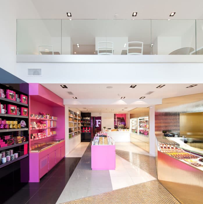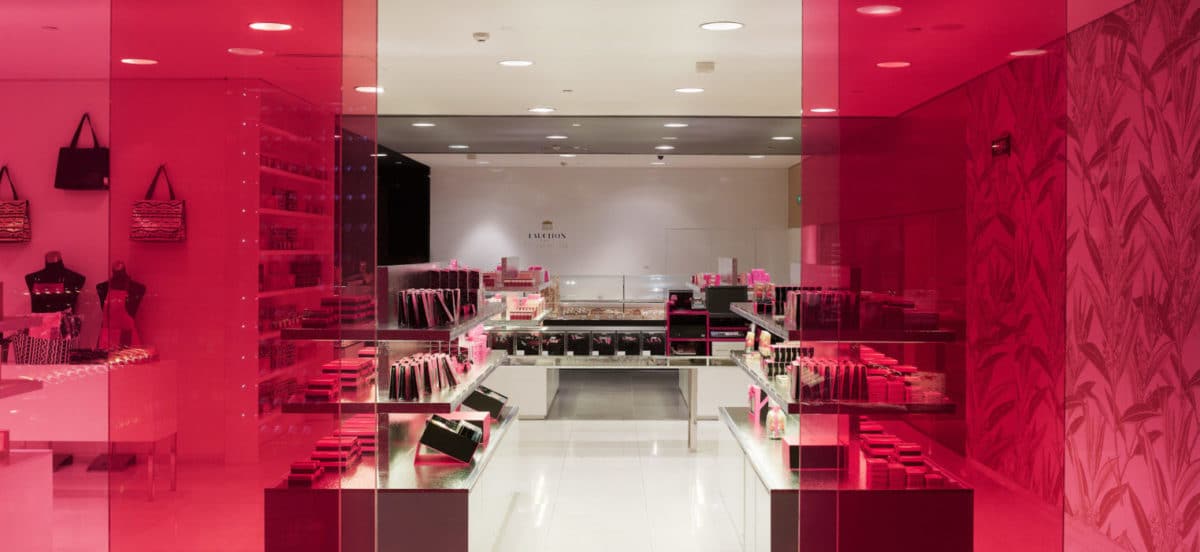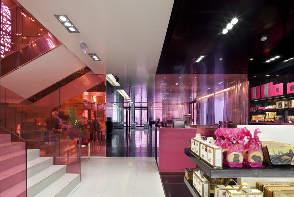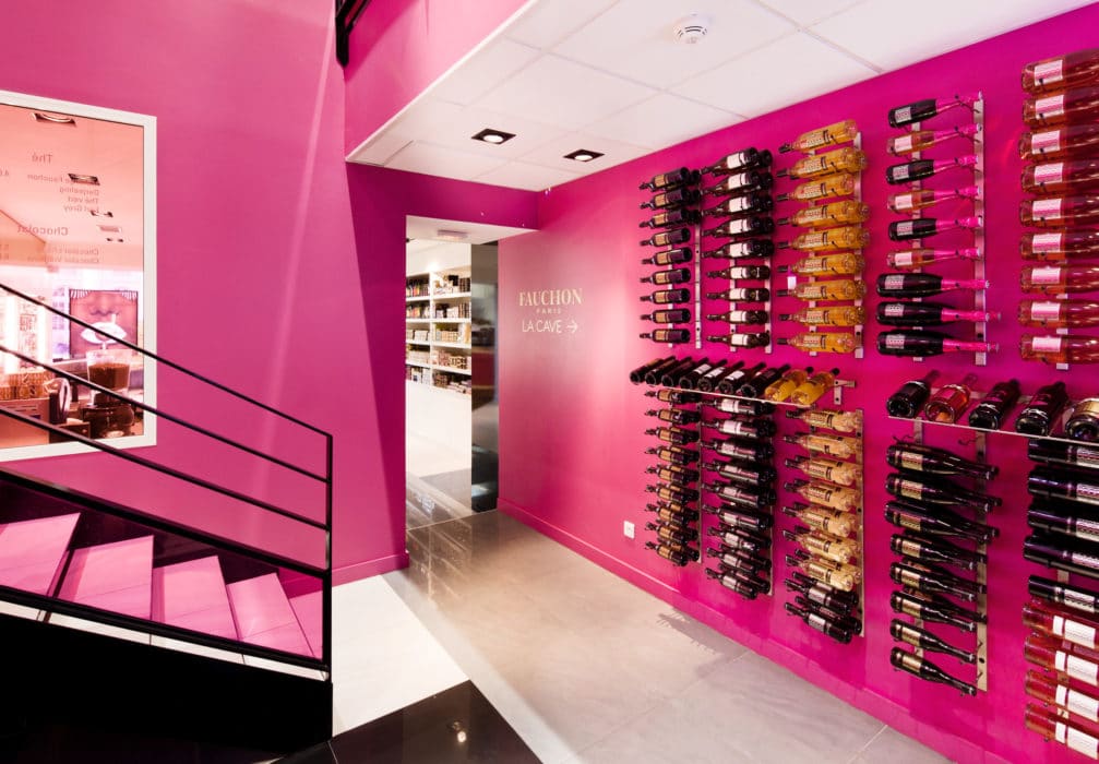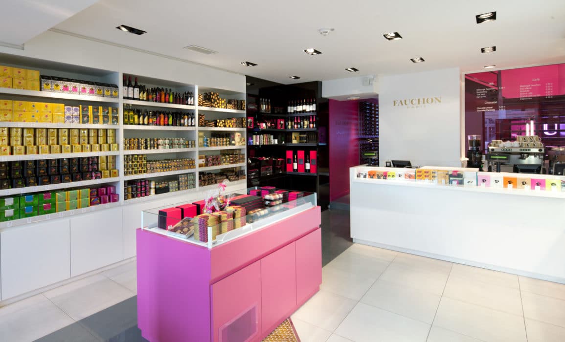 La maison Fauchon se distingue par trois ambiances : une ambiance noir/blanc/gris, qu’on retrouve dans les espaces épicerie, une ambiance or pour les espaces boulangerie, viennoiserie et café, et enfin une ambiance argent pour le restaurant, légère et lumineuse comme la cuisine vue par Fauchon. Les différents espaces communiquent par des portes et des cages d’escalier où l’on retrouve le rose fuchsia qui célèbre la marque.