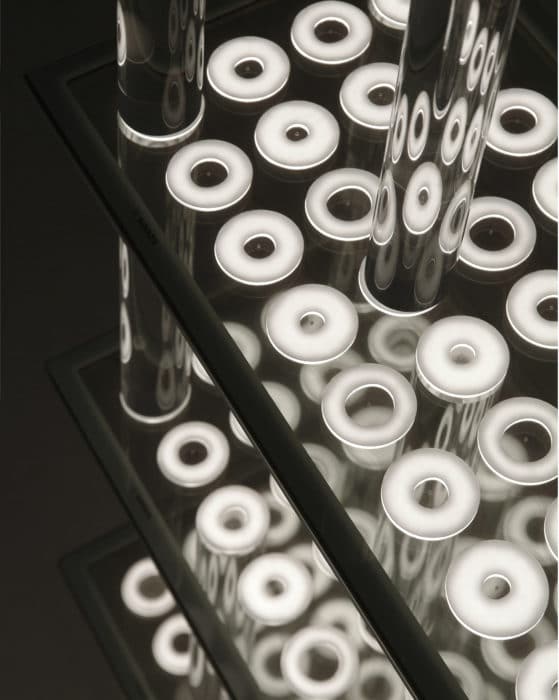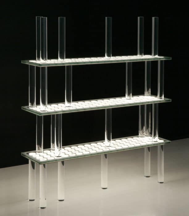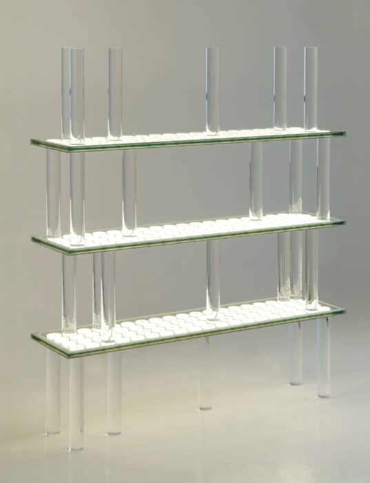 Étagère réalisée en PLANILUM™, panneau de verre à motif éclairant qui fait appel au principe technologique de la fluorescence des sources lumineuses, principe testé durant de nombreuses années.