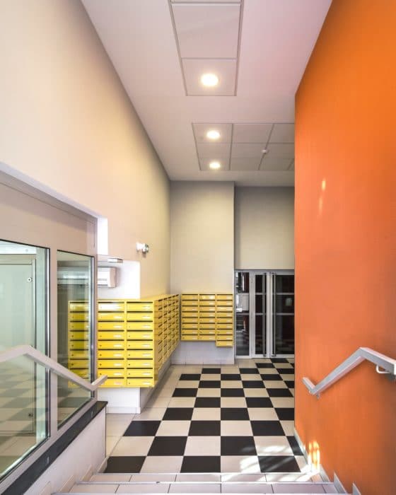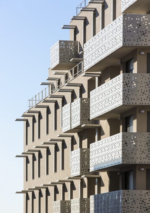 Une volumétrie compacte a été privilégiée dans l’idée d’une continuité avec les nombreux immeubles administratifs qui jalonnent le boulevard Charles Nédelec. Elle est rythmée par les brise-soleil et sous-faces de balcon qui apporte fraîcheur aux logements et confèrent aux façades leur caractère graphique.