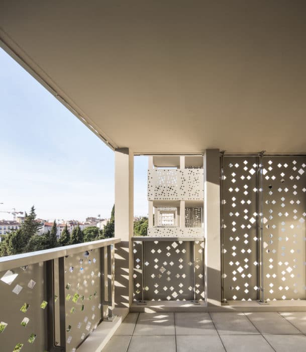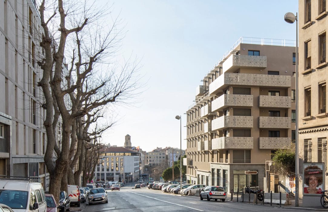 Côté cour, un jardin méditerranéen planté de palmiers confère à l’ensemble immobilier une ambiance très différente. Les terrasses superposées comme des totems et les vues – sur la mer pour les appartements situés au dessus du troisième étage – évoquent le Marseille balnéaire que la densité de la ville s’amuse à montrer ou cacher.