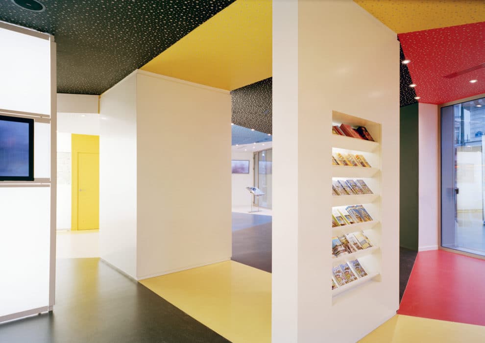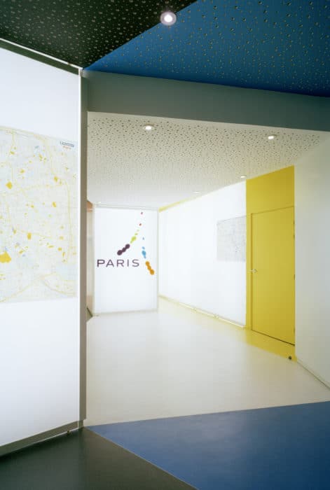 L’aménagement intérieur est comme un kaléidoscope de couleurs primaires, montrant Paris sous des facettes plus modernes que ses traditionnels poncifs. Pouvant accueillir plusieurs milliers de visiteurs par jours, le lieu exige des finitions simples et robustes. Tous les éléments verticaux sont blancs, opaques (mobilier) ou rétroéclairés (parois). Le sol en résine et le plafond en plâtre sont découpés selon des formes trapézoïdales identiques, comme un écho à la forme du parcellaire parisien, ramené à l’échelle des visiteurs.