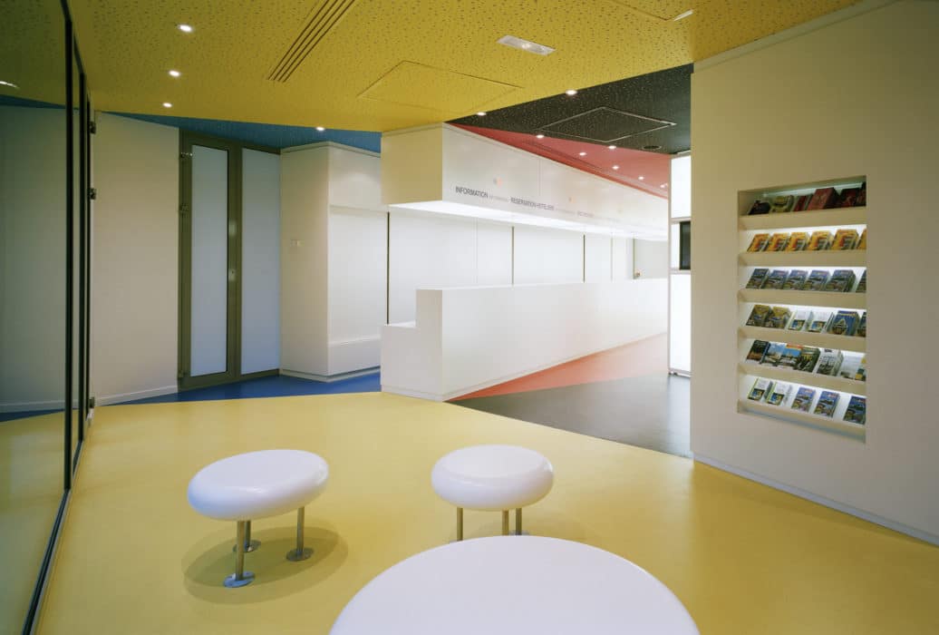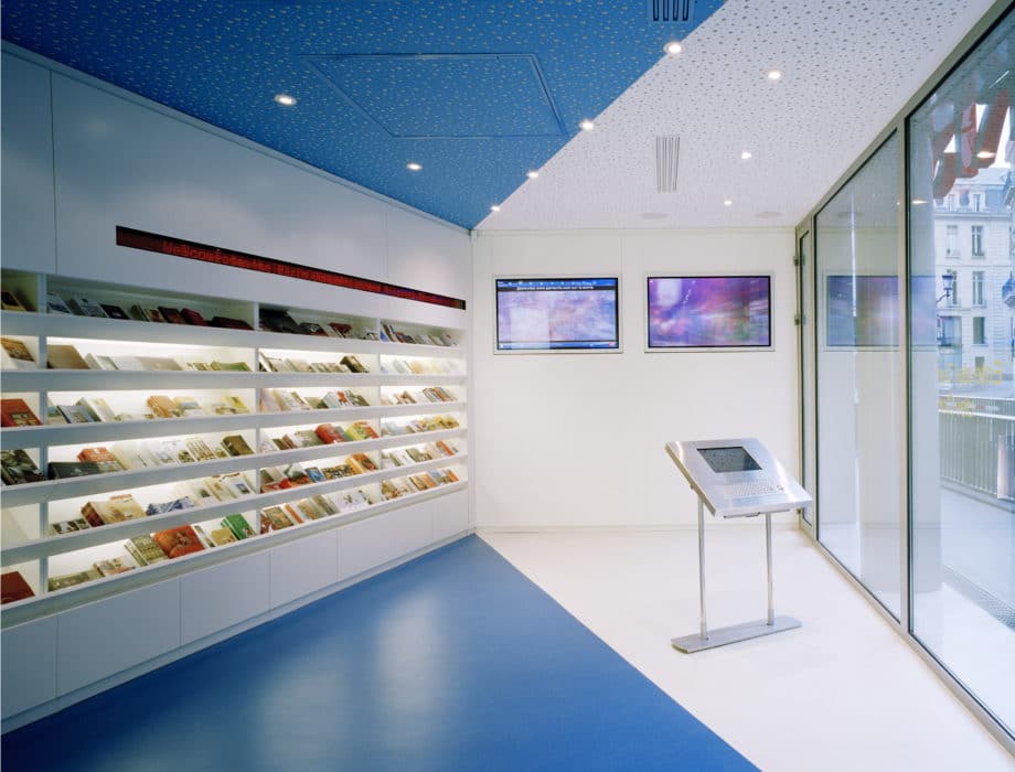Situé au rez-de chaussée et à l’entresol d’un immeuble typique de l’avenue de l’Opéra, l’espace d’accueil principal de l’Office du Tourisme et des Congrès de Paris (OTCP) accueille un comptoir d’information, un espace d’attente et une zone de libre service. Ses façades en verre et inox sont conçues comme des boîtes qui sortent des grandes baies découpées sur deux niveaux. La porte d’entrée est pensée comme une version abstraite des grandes portes bleues de l’avenue de l’Opéra, avec doubles vantaux et fenêtre à l’entresol.