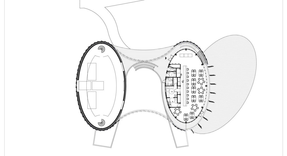 Le bâtiment vinicole est implanté dans la partie Sud du terrain, à proximité de l’entrée du domaine. Sa silhouette courbe s’inspire les formes du paysage qui l’entoure. Sa hauteur varie selon le dessin de la courbe de 4 à 6m. Son volume est entièrement couvert de panneaux en bardage en bois pré-grisé ; une échancrure permet d’en signaler l’entrée. Certains panneaux pivotent sur un axe vertical formant volet, et permettent l’accès à une terrasse disposée en continuité. Le rez-de-chaussée abrite le restaurant et la boutique, un niveau de sous-sol accueille les locaux destinés à la production et l’élevage du vin.
