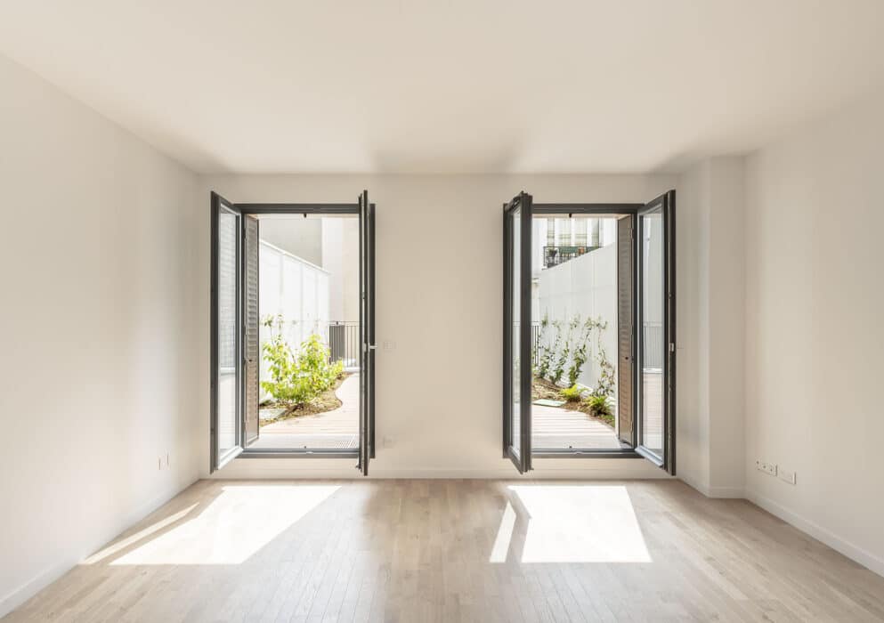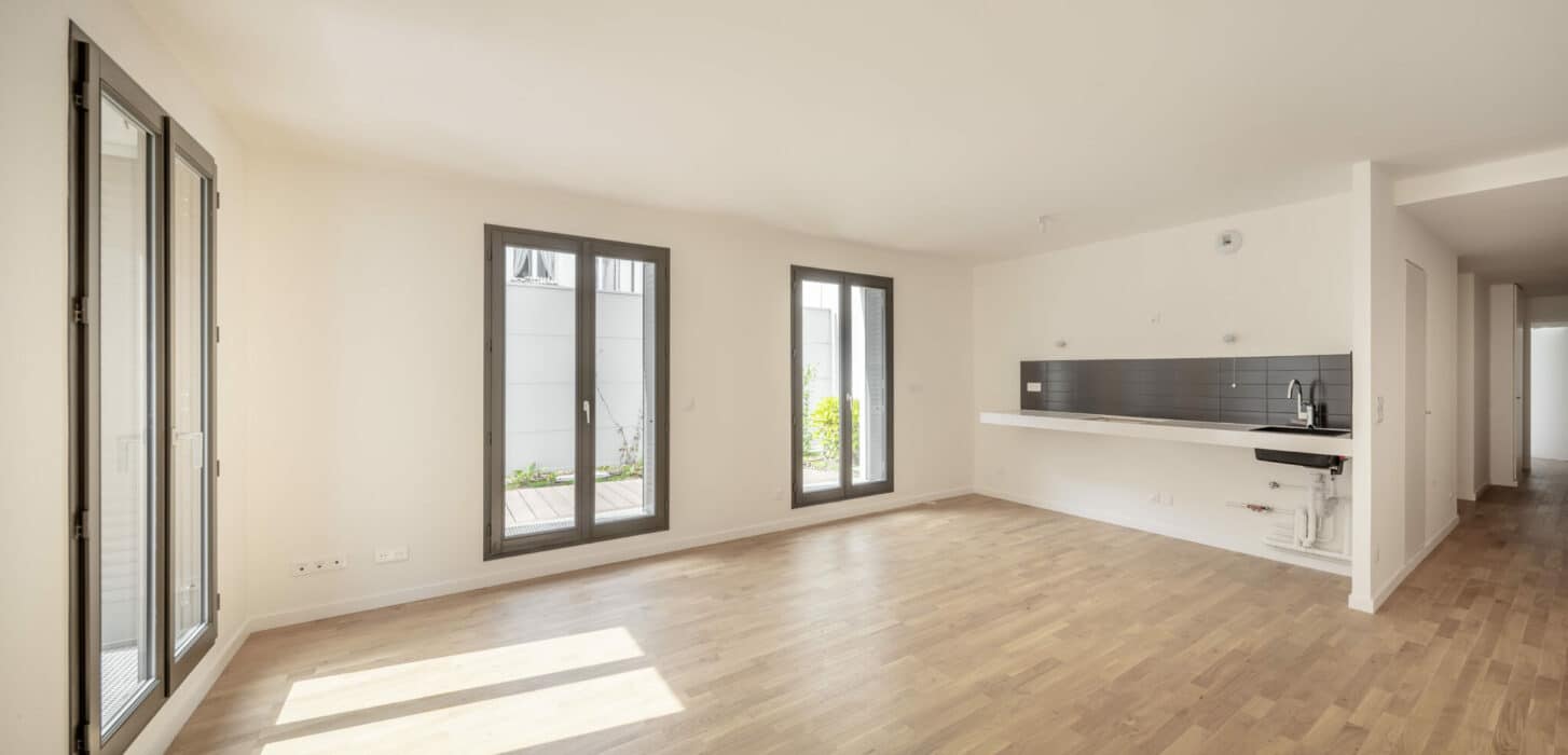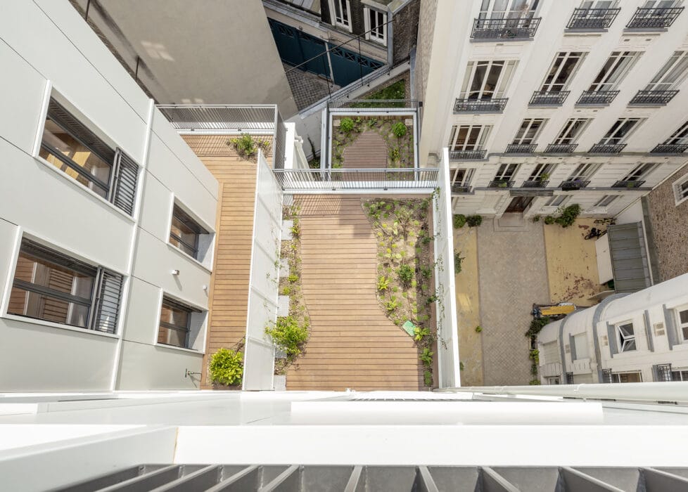 Sur la cour, la façade présente plusieurs retraits qui permettent l’implantation de deux jardins suspendus, formant avec le jardin en pleine terre une série de trois espaces plantés qui intègrent la nature dans le cœur de l’ilot.