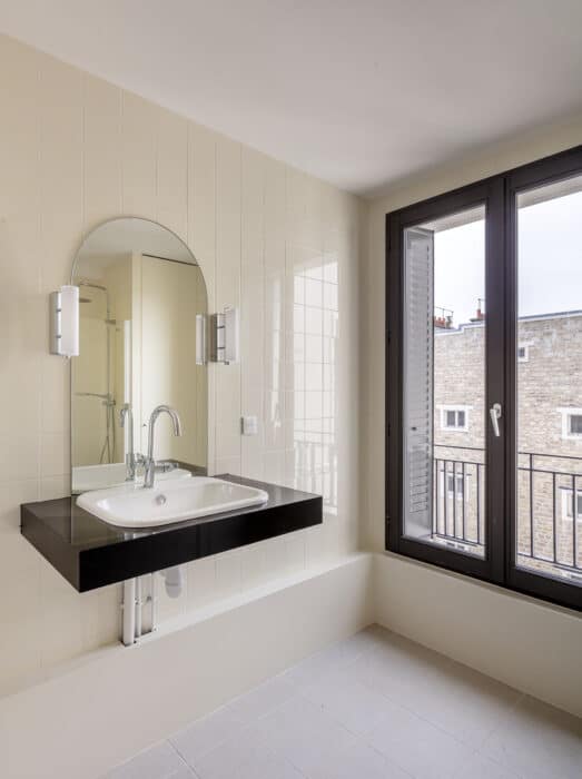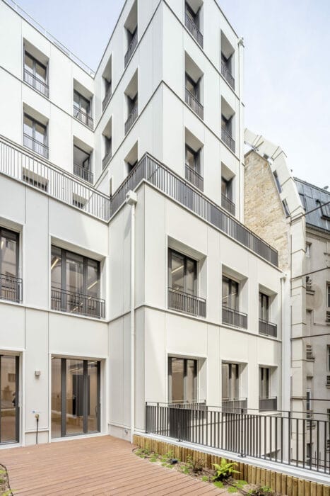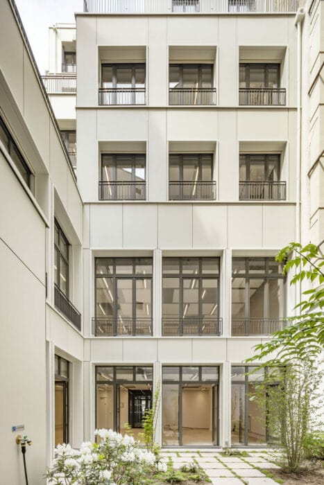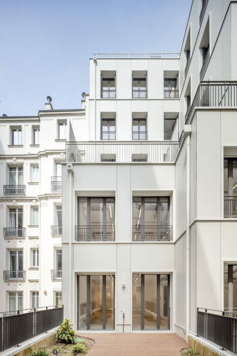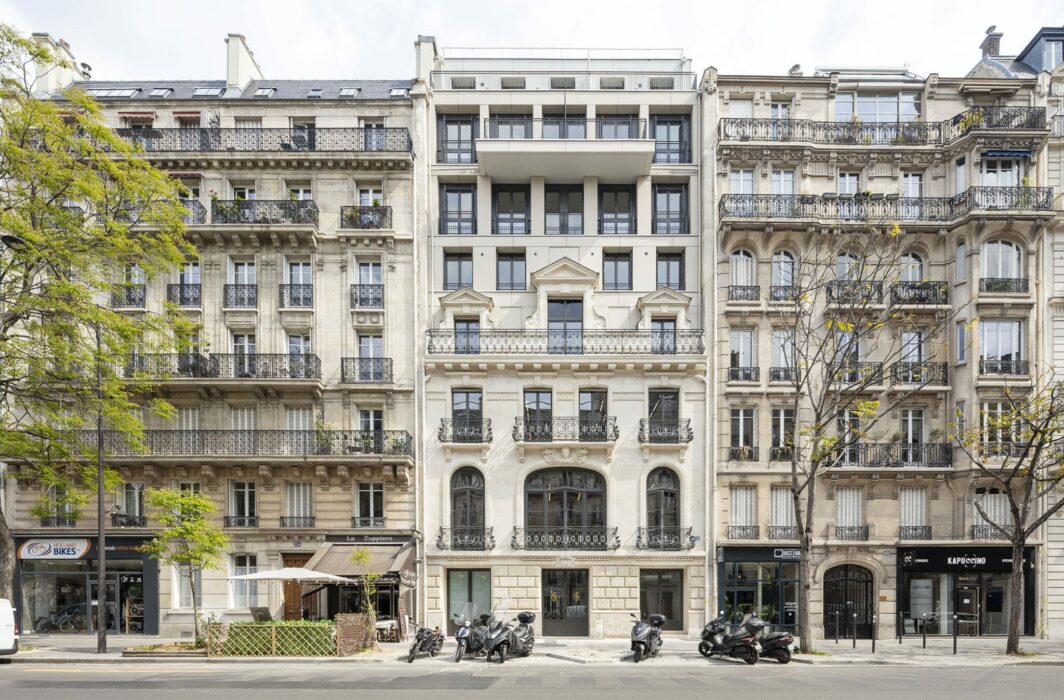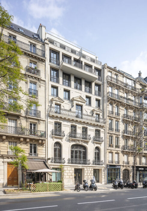 Sur l’avenue Wagram, le dessin de la façade s’appuie sur l’analyse de la façade de 1886 et propose de se prolonger vers le ciel, dans une superposition de cadres et de percements décalés qui revisitent le langage de l’architecture classique. L’extension a elle aussi été pensée selon les critères de qualité énoncés par Haussmann que sont la lisibilité, la mixité, l’hygiène, la légèreté et la flexibilité.
