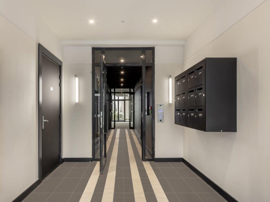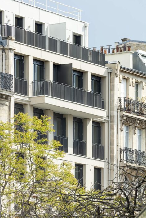 Le traitement monochrome de l’ensemble participe à l’intégration du projet dans l’ambiance de l’avenue de Wagram. C’est un peu comme si l’immeuble avait ‘’poussé’’, avait généré une extension de lui-même, plus sobre, plus lisse, plus orthogonale.